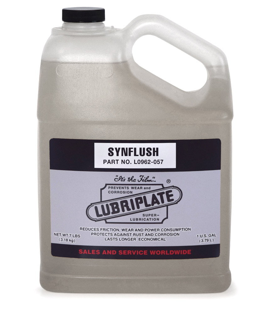 LUBRIPLATE SYNFLUSH is a premium quality, pure synthetic fluid designed to clean and dissolve varnish/deposits found in rotary screw and reciprocating type air compressors while the compressor is in operation. It is compatible with petroleum/mineral oils as well as all LUBRIPLATE Synthetic Compressor Fluids and most other synthetic fluids. Contact us for compatibility verification. LUBRIPLATE SYNFLUSH is also designed for flushing compressors converting from petroleum/mineral oil to synthetic fluids. The flushing procedure removes the remaining petroleum oil that is unable to be removed by draining alone as well as cleaning the compressor prior to introducing the new synthetic fluid. LUBRIPLATE SYNFLUSH can also be used to clean hydraulic systems, gearboxes and reducers, FRL’s (Airline Oilers) and close looped circulating oil systems. LUBRIPLATE SYNFLUSH is not intended for automotive/diesel applications such as cleaning fuel injectors or crankcases.