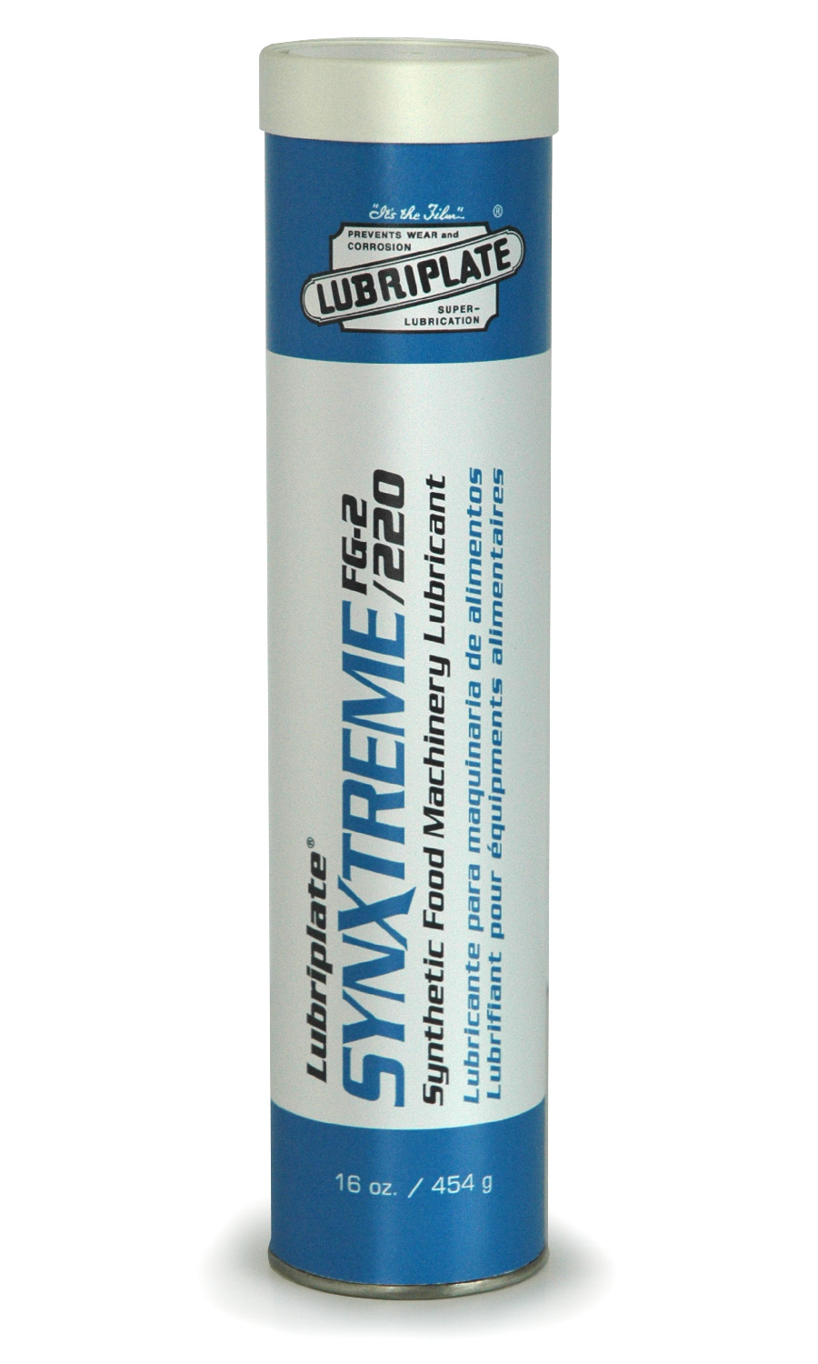 Now treated with LUBRI-ARMOUR, LUBRIPLATE’s anti-microbial additive developed to prevent the decomposition of lubricants caused by microorganisms. LUBRIPLATE SYNXTREME FG greases treated with LUBRI-ARMOUR, remain fresh and last longer in harsh food processing plant environments. LUBRIPLATE SYNXTREME FG/220 products are 100% synthetic, calcium sulfonate based greases. Their advanced technology delivers outstanding shear stability, reduced wear and excellent resistance to water and other corrosive substances. These food grade greases are manufactured with ingredients that comply with FDA 21 CFR 178.3570, FDA 21 CFR 172.882 and FDA 21 CFR 182 G.R.A.S. The heavy, 100% synthetic fluid used in these greases delivers increased oxidation stability and enables them to be effective at application temperatures between 450ºF and 500ºF with frequent re-lubrication intervals.